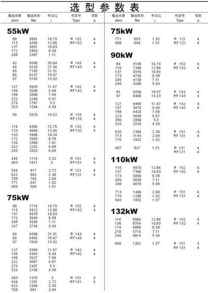 選型參數表55kW,75kW,90kW,110kW,132kW